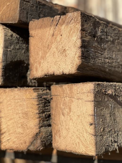 Koristimo recikliranu hrastovu građu dobivenu dekonstrukcijom starih slavonskih kuća i objekata. Svaka stara drvena građa, bilo da se radi o hrastovim gredama, rogovima ili plankama, prolazi kroz proces ručne obrade kako bismo osigurali da svaki komad zadrži patinu, prirodne godove i ožiljke vremena. Završnu obradu radimo s kvalitetnim uljima i lakovima za drvo, čime osiguravamo dugotrajnost i otpornost.