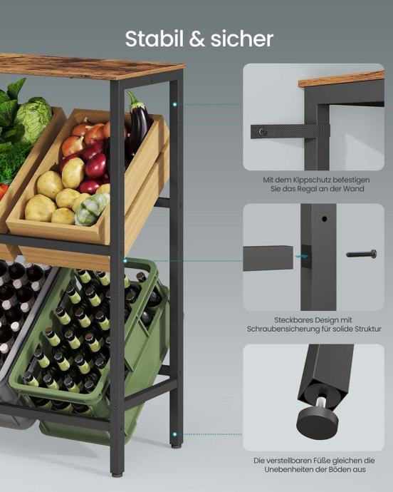 Robustan i stabilan: Vrhunski čelik, utični dizajn s vijčanim pričvršćivanjem i okvir od kvadratnih cijevi čine stalak za piće visoko nosivim (svaka razina do 150 kg) i stabilnim; podesive nožice pružaju dodatnu stabilnost