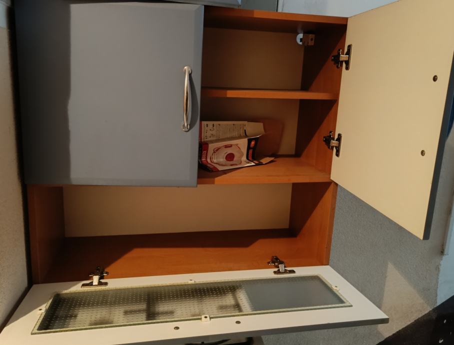 Dupla vrata bočno otvaranje, unutra jedna polica, ispod polica sa staklom otvaranje prema dolje