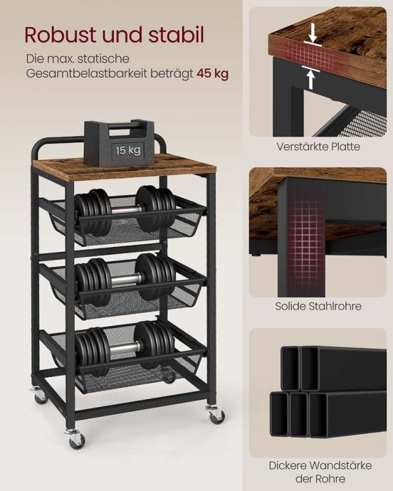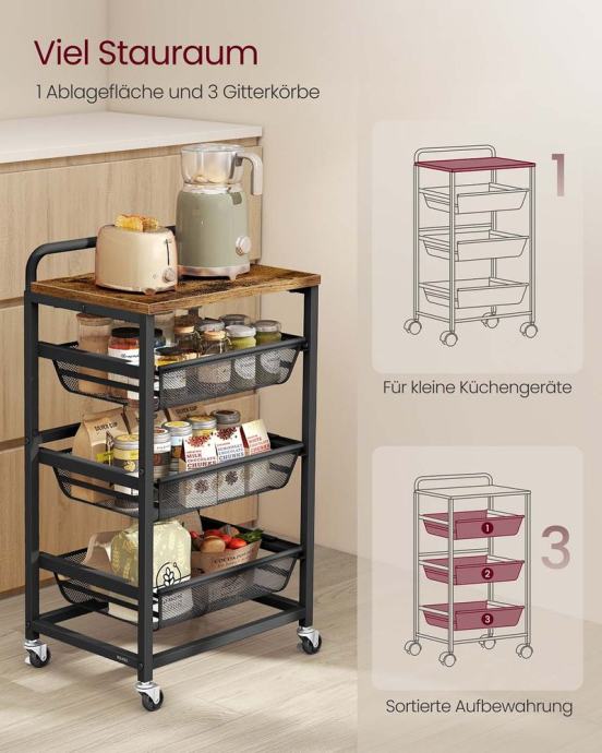 Robusna konstrukcija: Metalni okvir kuhinjske police je stabilan i izdržljiv. Svaka košara može izdržati do 10 kg. Gornja ploča može izdržati do 15 kg.