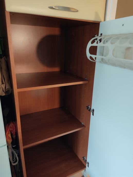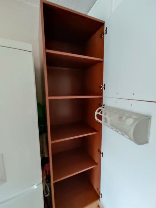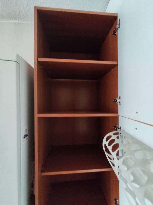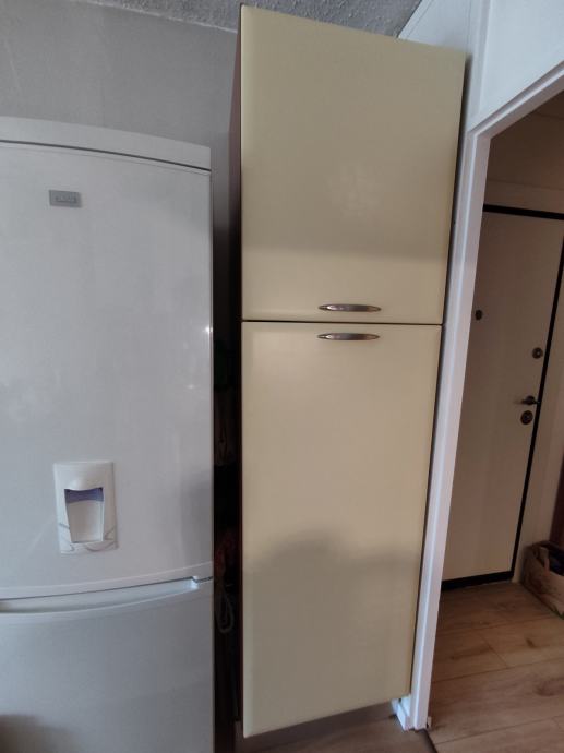 Prodajem samostojeći kuhinjski element - visoki ormar. Ima više polica, pogodan za spremanje posuđa, namirnica ili kao dodatni spremnik u kuhinji ili ostavi. Boja fronte je svijetla (vanilija / svijetlo žuta), s drvenom unutrašnjosti i metalnim ručkama. Očuvan je, bez oštećenja i spreman za korištenje.
