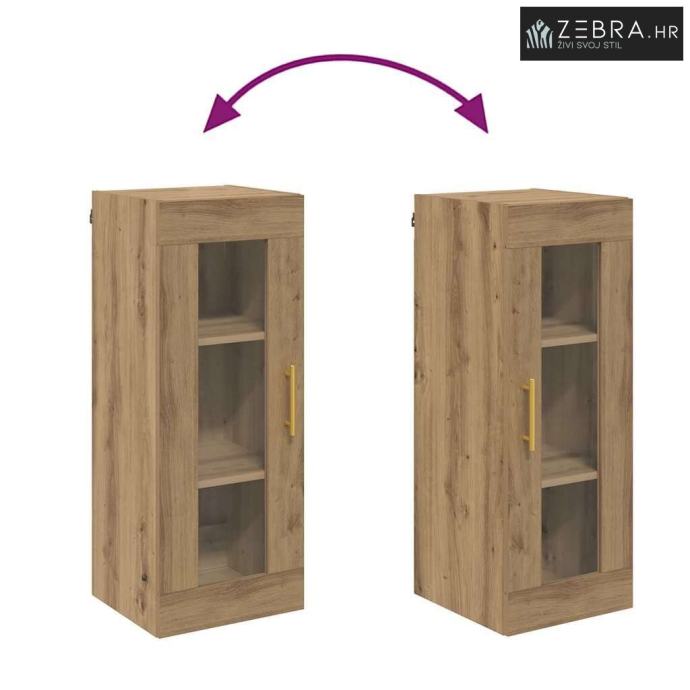 Materijali: Napravljen od konstruiranog drva i stakla, ormar donosi stil i izdržljivost. Konstruirano drvo daje snagu, a staklena vrata dodaju eleganciju, omogućujući vam da vidite što je unutra, poboljšavajući tako vizualni dojam. Uključene komponente: Ormar dolazi s modernim, matiranim metalnim ručkama u zlatnoj boji, koje dodatno ističu njegov dizajn. Police su od čvrstog drva i pružaju jako dobru podršku, sprječavajući savijanje tijekom vremena. Sve to osigurava da ormar bude funkcionalno i elegantno skladište. Karakteristike: Ovaj zidno montirani ormar štedite prostor bez gubitka kapaciteta. Njegov pravokutni oblik omogućuje fleksibilno postavljanje, dok nudi dovoljno prostora za pohranu knjiga, dekoracija ili svakodnevnih stvari. Preporučena upotreba: Idealan je za dnevne boravke, pomaže u organizaciji i doprinosi stilu. Svestran dizajn omogućuje mu da se uklopi u različite stilove, od modernih do tradicionalnih interijera, optimizirajući prostor u svakom domu. Njega i održavanje: Održavanje izgleda ovog ormara je lako. Samo ga obrišite suhom krpom i provjerite da je dobro montiran kako biste spriječili prevrtanje. Slijedite upute za instalaciju kako biste osigurali stabilnost i sigurnost. Boja: Umjetnički hrast