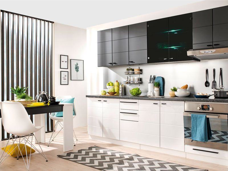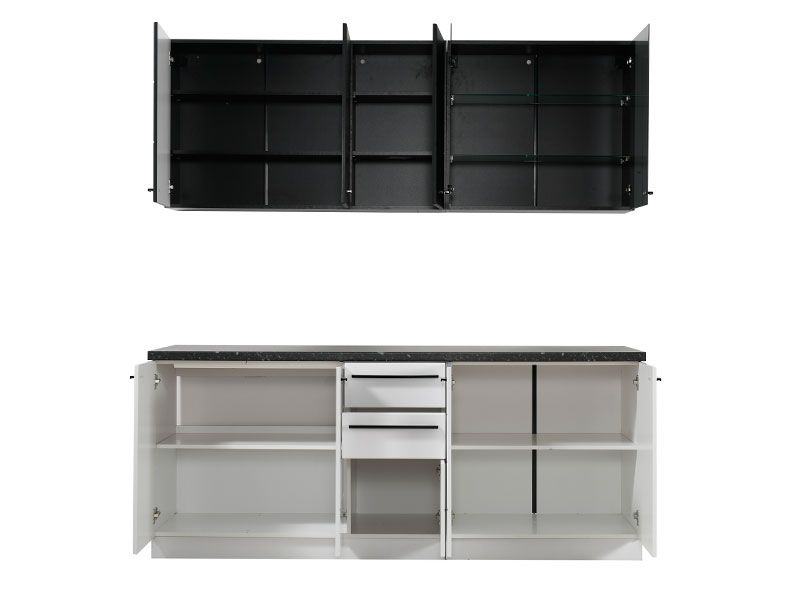 Kuhinja CLAUDIA 200cm, u kombinaciji opak bijele i crne, sa bijelom 3D MDF lak folijom na frontovima donjih dijelova, i crnom 3D MDF mat folijom na frontovima visećih dijelova, osmišljena je da zadovolji funkcionalne i estetske zahteve u opremanju kuhinjskog interijera. Jednokrilni i dvokrilni viseći elementi, kao i donji dvokrilni elemetni sa funkcionalnim ladicama, pružaju dovoljno prostora za odlaganje posuđa, a poseban šmek kuhinji CLAUDIA 200cm daje crno staklo kroz koje se vidi LED rasveta, kojom možete osvežiti kuhinju.