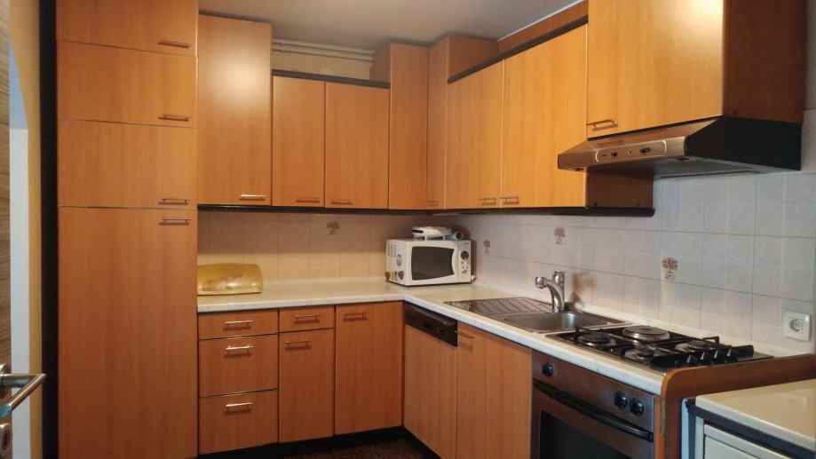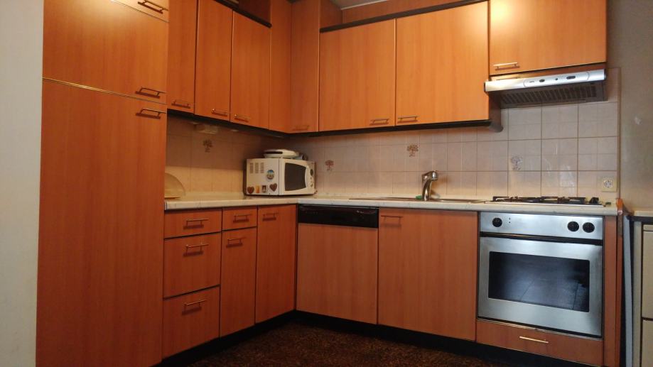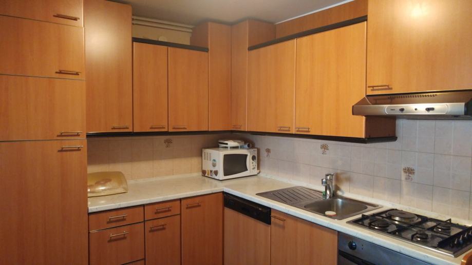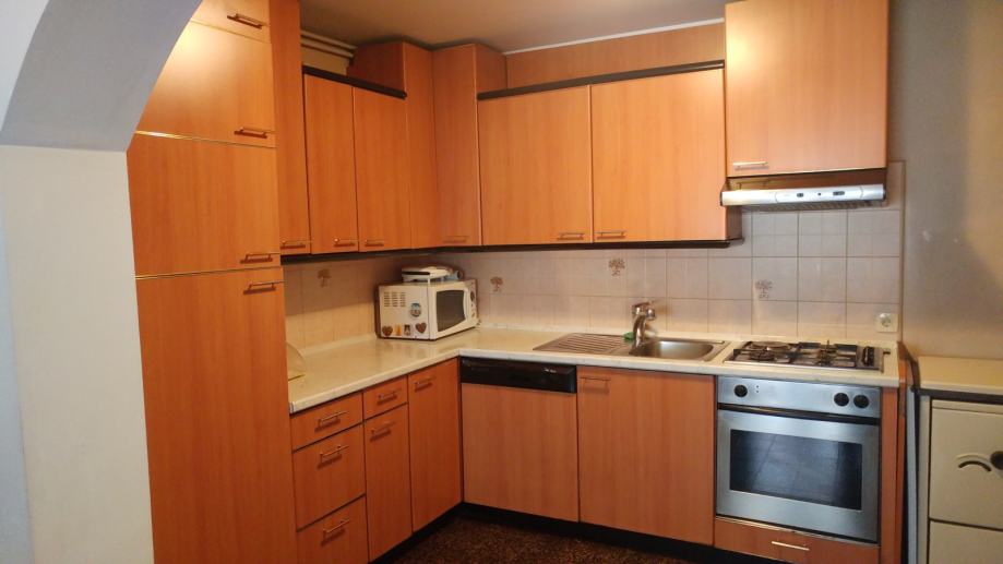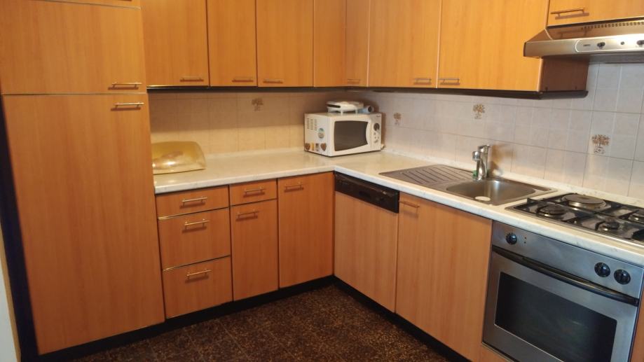Prodajem ugradbenu kuhinju s ukljucenim aparatima(frizider 120cm ,perilica 60cm,napa, ploca za kuhanje i stednjak). Kuhinja je radena po mjeri od drveta tresnje gornji i donji elementi ukljuceni, dimenzija 2, 3 mx 2,37 m.