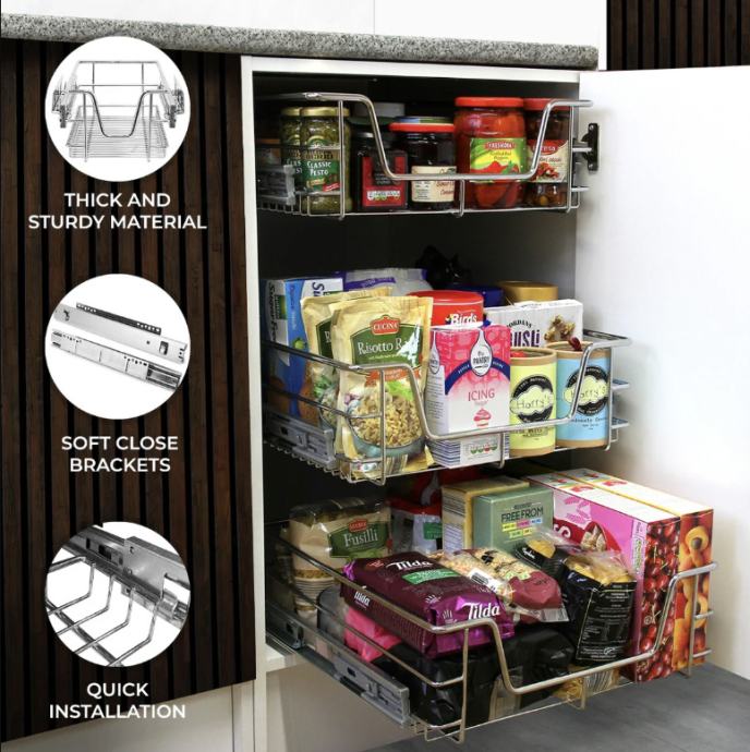 Naše izvlačne metalne kuhinjske košare za pohranu pružaju izvrsno upravljanje za maksimalno iskorištavanje prostora za pohranu. S klizačima s kugličnim ležajevima za potpuno izvlačenje, ove snažne i čvrste košare glatko će se izvlačiti iz ormarića za jednostavno i praktično rješenje za pohranu.Izrađena od nehrđajućeg čelika vrhunske kvalitete, košara je izuzetno snažna i izdržljiva, što joj omogućuje da izdrži predmete u vašem kuhinjskom ormariću, ostavu ili pomoćnoj prostoriji. Izdržljiva svakodnevna upotreba u zahtjevnim komercijalnim kuhinjama i kućanstvima, nevjerojatan kapacitet od 15-20 kg po košari može održavati ova okruženja. Dodavanje prostrane košare u vaš ormarić može ponuditi dodatno rješenje za uštedu prostora za vaše uređaje, opremu, suhu robu ili sredstva za čišćenje nadohvat ruke.Naš snažni nehrđajući čelik doprinosi debljini metala od 3 mm i žici od 9 mm kako bi se dodala čvrstoća i stabilnost. Uključujući i vodilice i nosače, omogućuje se ergonomska upotreba za korisnika na različitim visinama kako bi se prilagodio vašem radnom okruženju. Pomoću priloženih vijaka možete bez napora sastaviti svoju košaru za nekoliko minuta kako biste mogli lako raditi i maksimalno iskoristiti svoj prostor za pohranu.Uljepšajte svoju kuhinju, spavaću sobu, radionicu ili pomoćnu prostoriju ovim izdržljivim i jednostavnim za ugradnju modernim metalnim košarama za pohranu. Svaka košara je napravljena tako da savršeno stane u kuhinjski ormarić ili vitrinu širine 600 mm (vanjska širina).