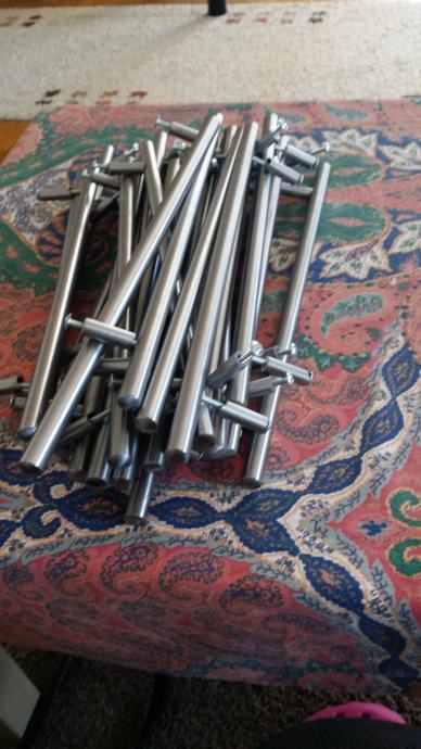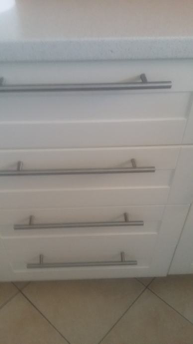 Kuhinja nova 3g.odljepile se fronte.Uskoro ću dobit nove fronte gdje ne idu ručke.Ručke smo skinuli i dostupne su.U ikeii su ove ručke 9 eu..Ja ih prodajem po 3 eu kom.fixsno. Pogledajte KALLROR ručke ikea cjena.Kutija za kuhinjski pribor je 70 kn.Druga kutija manja za escajg je 20kn.Može i za ormare.Moji ormari imaju iste ručke.