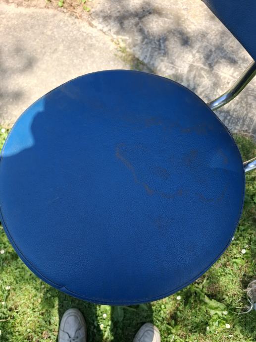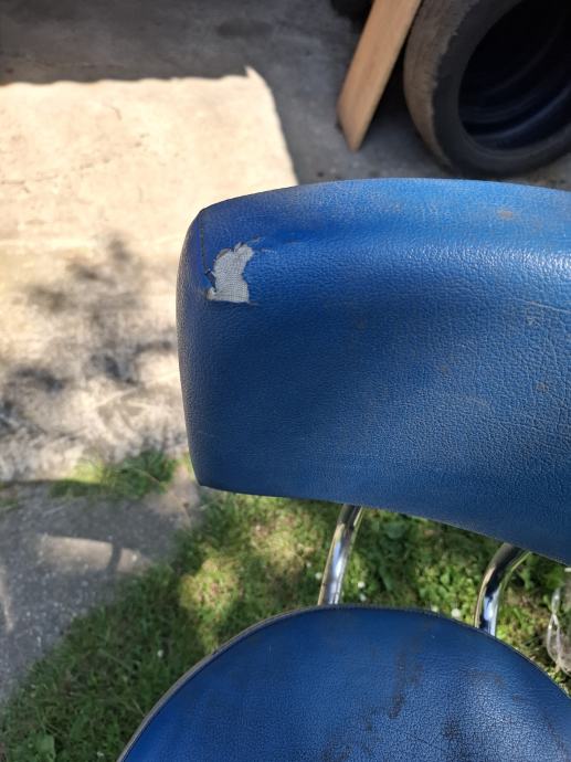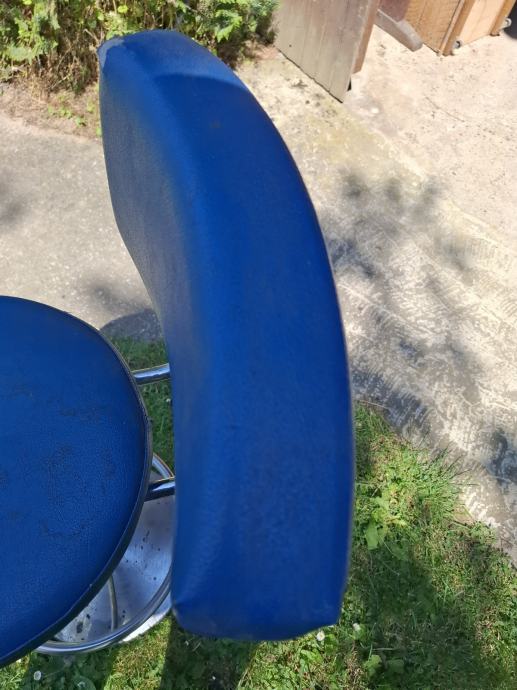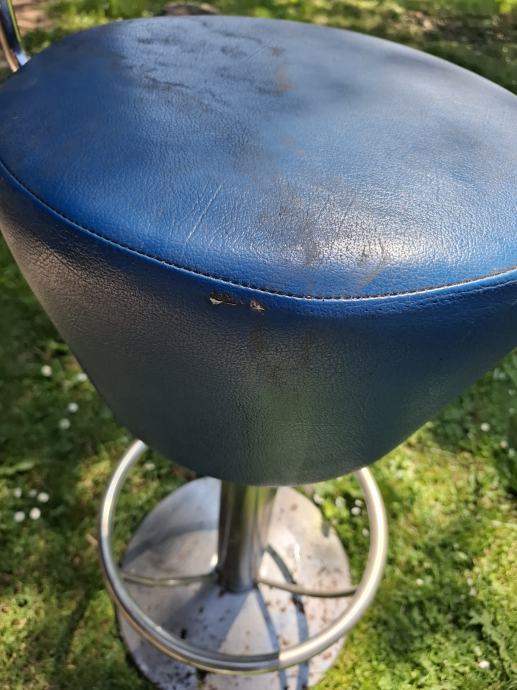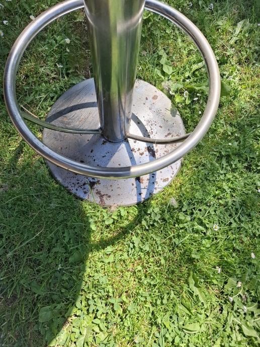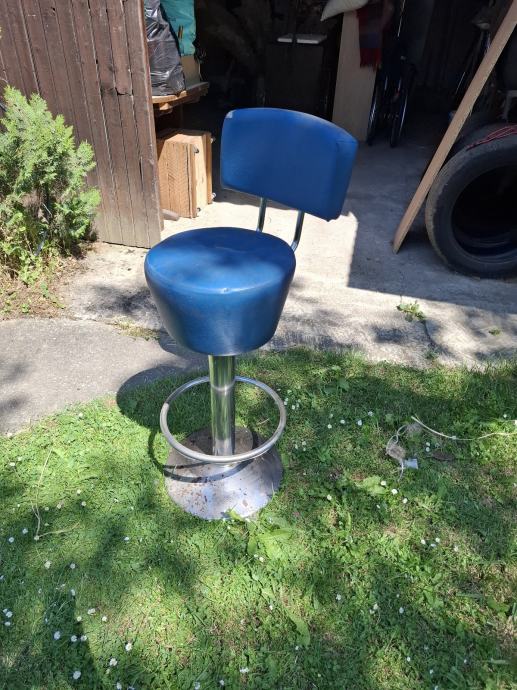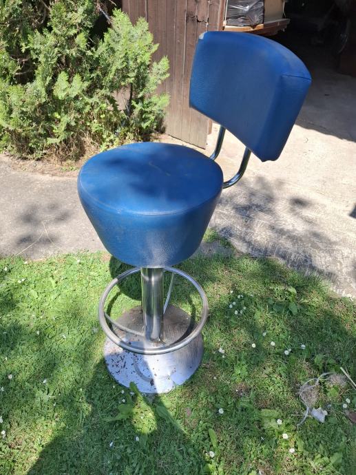 Prodajem masivnu/ tešku barsku stolicu sa slike. Stolica je okretna, nema podešavanja visine. Visina stolice je 80 cm, visina naslona je 107 cm. Na stolici su vidljivi tragovi korištenja, vidi slike.