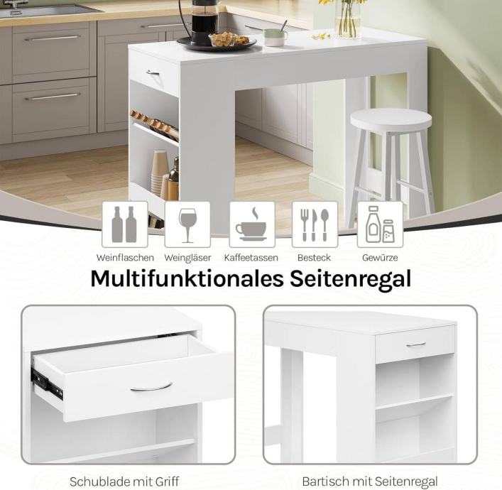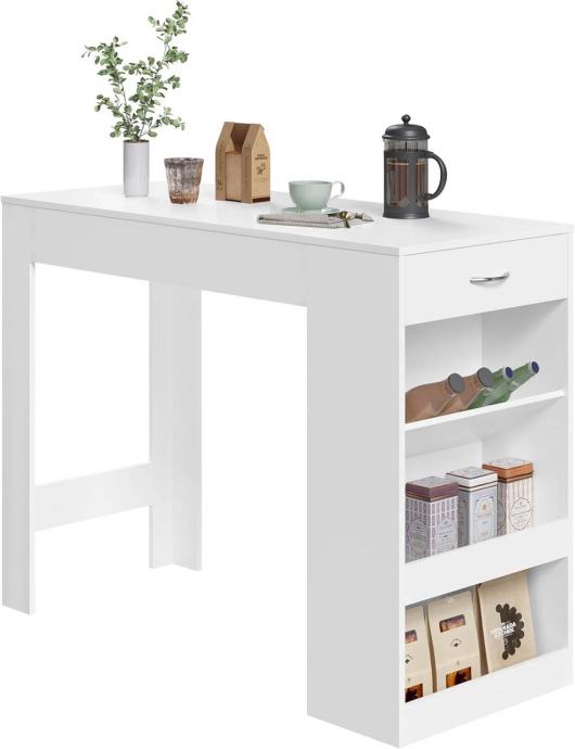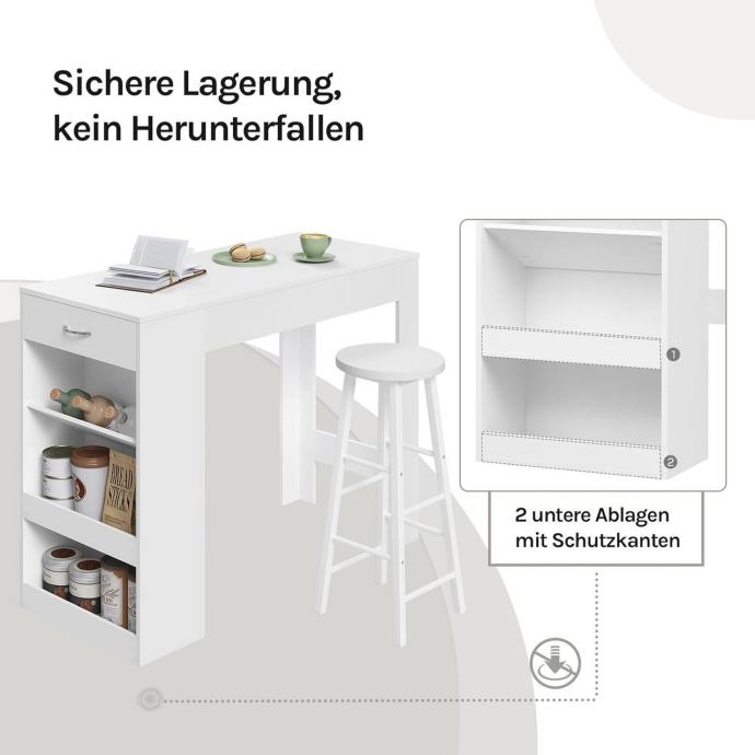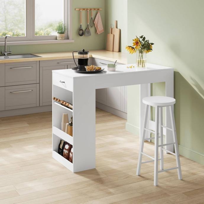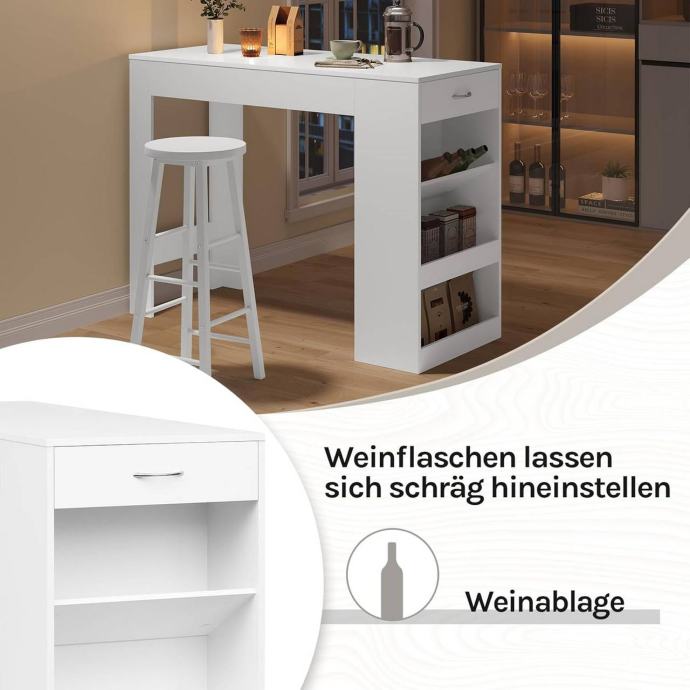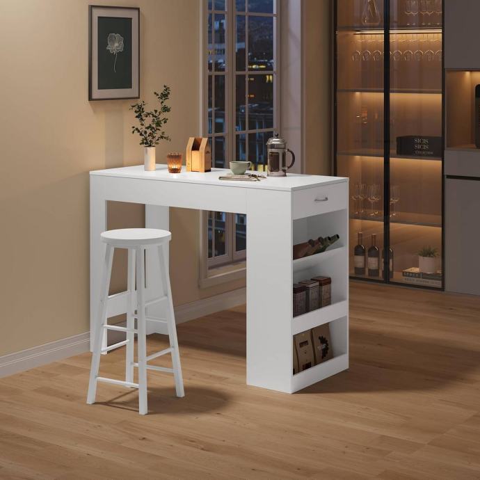 Ovaj praktični barski stol nudi višestruku funkcionalnost za pohranu i organizaciju. Opremljen je prostranom ladicom, integriranim stalkom za vino te tri dodatne police za čaše, boce i ostale predmete, čime su sve potrepštine uvijek nadohvat ruke.