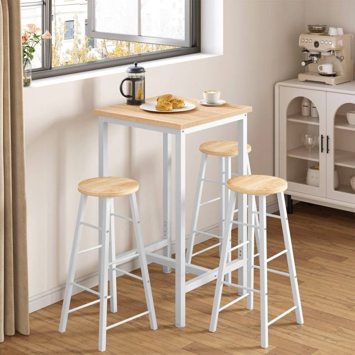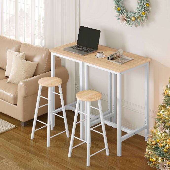 Ovaj kompaktni barski stol kombinira čvrstu metalnu konstrukciju s E1-certificiranim drvenim panelima, a njegova debela ploča podnosi opterećenje do 100 kg bez deformacija. Stol je idealan za male prostorije ili kuhinje, dimenzija 60 × 60 cm, a visina od 100 cm omogućuje smještaj dviju stolica ispod stola, štedeći prostor.