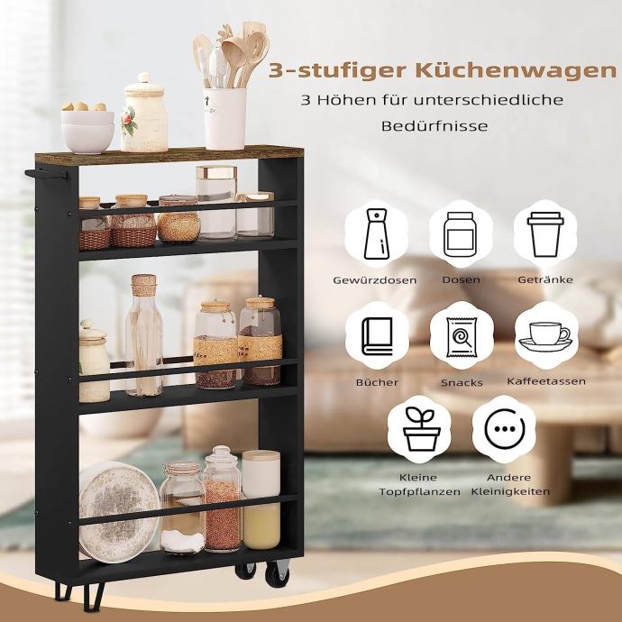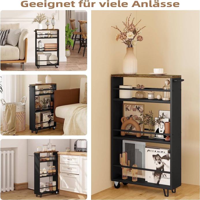 Ova praktična kuhinjska kolica dimenzija 47 x 80 x 13 cm nude kompaktno i funkcionalno rješenje za dodatni prostor za pohranu. S tri otvorene police na različitim visinama – 14,5 cm, 26 cm i 29,5 cm – kolica omogućuju fleksibilno slaganje začina, posuđa, knjiga ili uredskog pribora. Bočne metalne šipke sprječavaju pad predmeta, a gornja polica pruža dodatni prostor za pohranu.