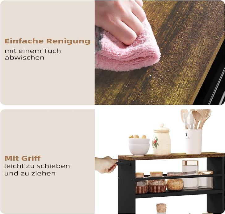 Robusna konstrukcija od E1 MDF-a s melaminskom obradom čini police glatkima, vodootpornima i lako održivima. Kolica su lagana, ali čvrsta, s nosivošću od 5 kg po polici i ukupnom nosivošću od 20 kg. Zahvaljujući univerzalnim kotačima – dva s kočnicama – i metalnoj ručki, kolica se lako pomiču i fiksiraju na željeno mjesto, čineći ih idealnima za kuhinju, dnevni boravak, ured ili uske prostore između namještaja.