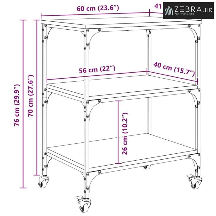 Kombinacija materijala: Kvalitetno konstruirano drvo i čelični elementi donose snagu i moderni izgled ovim kolica. Površina je glatka i lako se čisti, dok čelični okvir naglašava industrijski stil i pruža stabilnost.