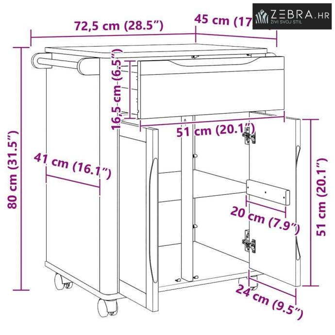 Optimalna pohrana: Kolica su opremljena raznim odjeljcima za uredno organiziranje kuhinjskih potrepština. Prostrane police primaju posuđe ili kuhinjske alate, dok ladice drže pribor za jelo pri ruci. Maksimiziraju prostor i stvaraju uredan ambijent.
