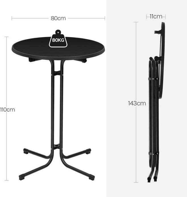 Okrugla gornja ploča promjera 80 cm i visine 110 cm pruža dovoljno prostora za piće i grickalice, dok široka baza promjera 90 cm povećava stabilnost. Ploča stola izrađena je od debelog drvnog materijala klase E1, a noge od čvrstih metalnih cijevi s praškastim premazom, što osigurava dugotrajnost i nosivost do 80 kg.