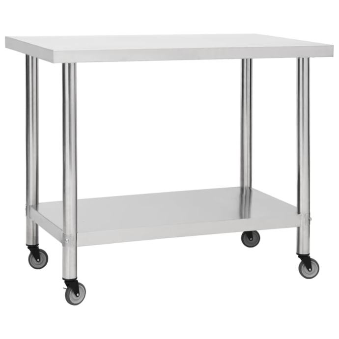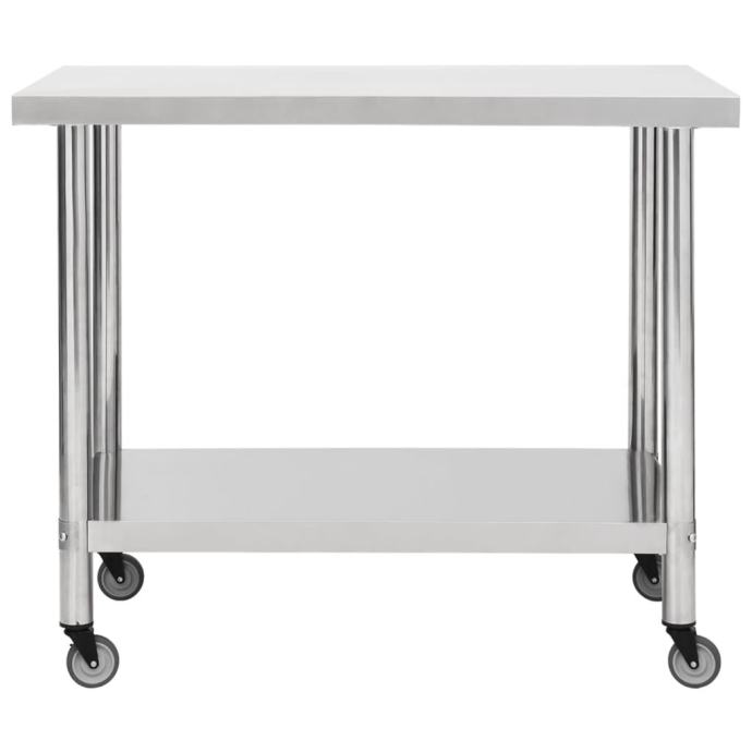 Ovaj gastronomski radni stol izrađen je od nehrđajućeg čelika, izdržljivog za doživotnu upotrebu. Glatka površina otporna je na koroziju i lako se čisti. Donja ploča nudi dodatni prostor za pohranu. Radni stol ima 4 pomična kotača tako da ga možete slobodno pomicati uokolo. Osim toga, 2 kotača imaju kočnice koje drže stol na mjestu.