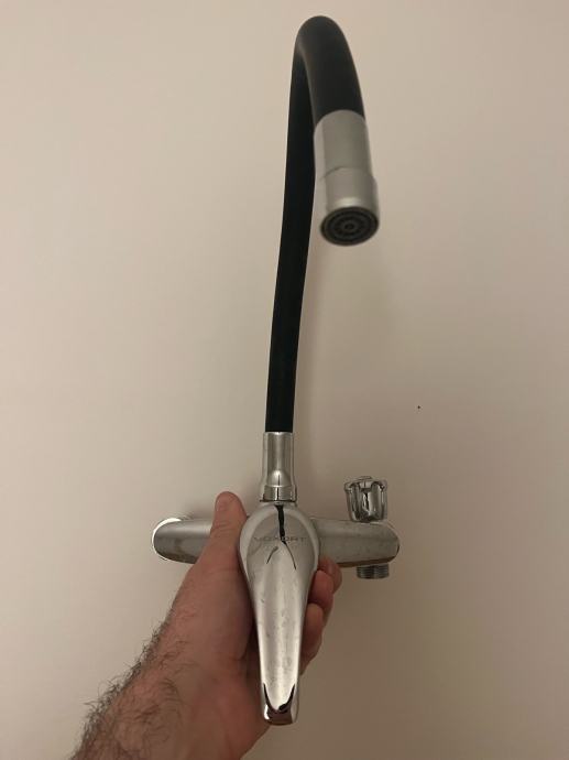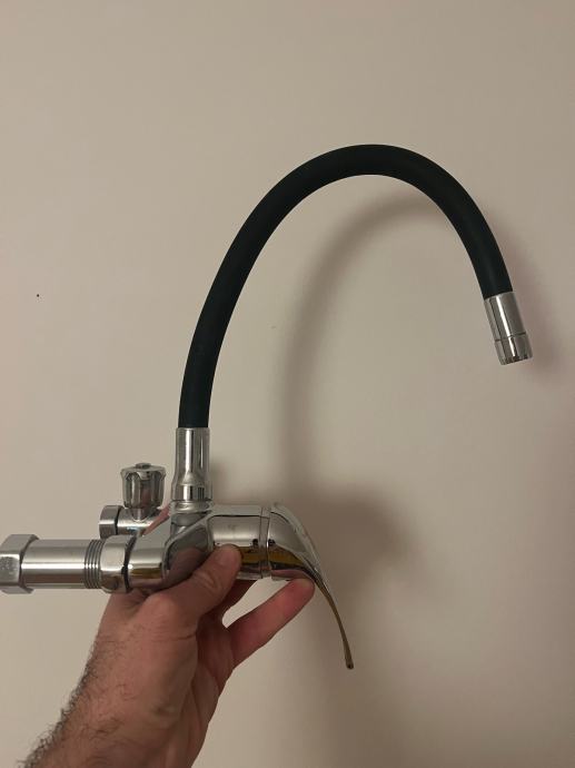 Prodajem rabljenu miješalicu za sudoper s fleksibilnom crnom cijevi i kromiranim tijelom. Slavina ima jednu ručku za regulaciju protoka i temperature vode, a fleksibilna cijev omogućuje usmjeravanje mlaza po potrebi.