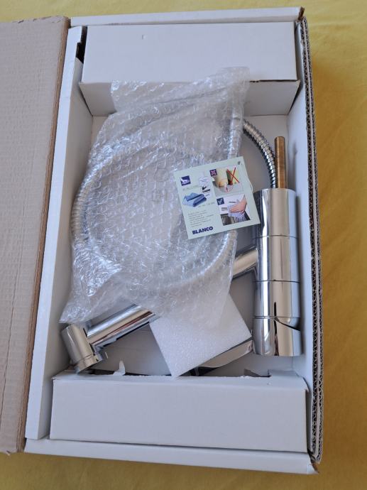 Prodajemo potpuno novu slavinu Blanco, jer nam ne odgovara visina.. Cijela je kromirana, ima izvlacni tus s 2 mlaza, kupljeno prosle godine u trgovini koja je zastupnik za Blanco program