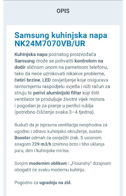 Prodajem ju jer mi je kuhinja premala, svega 2 sa 2.5 kvadrata te se nikako ne uklapa u raspored koji sam zamislio. Ipak moram uzeti ugradbenu napu !