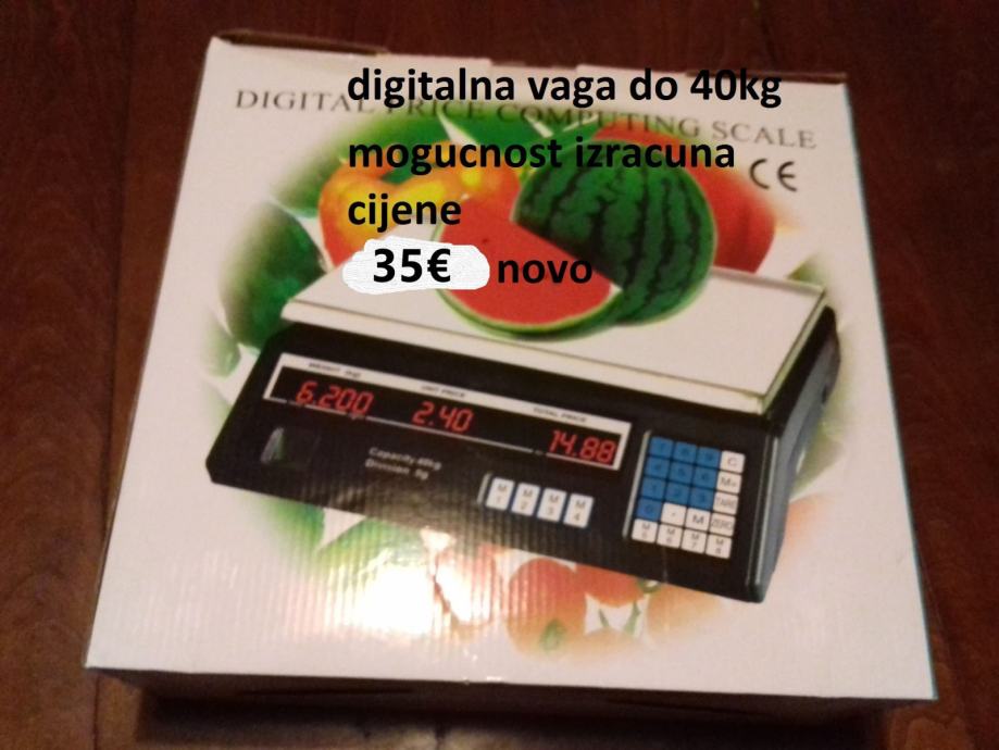 prodajem novu digitalnu vagu otvorena samo za slikanje i probu vaze do 40 kilograma ima izracun cijene ima svoj punjac tako da vam nije potrebna struja pogodno za prodaju voca i povrca na trznicama i slicno cijena je 35€ fixno moze osobno preuzimanje i proba naravno ili slanje postom ako smo daleko