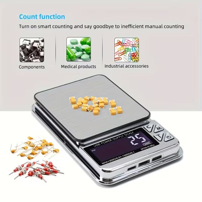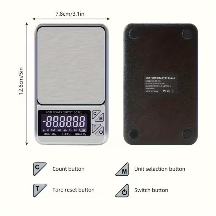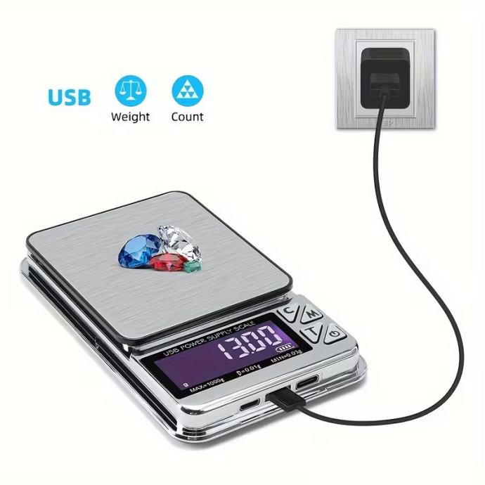 Digitalna vaga od nehrđajućeg čelika, preciznost 1000 g x 0,01 g, punjiva putem USB-a s litijevom baterijom od 300 mAh, LCD zaslon, za nakit, kuhinju, medicinske proizvode, industrijski pribor - sigurno za kontakt s hranom