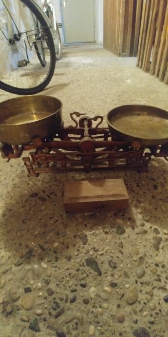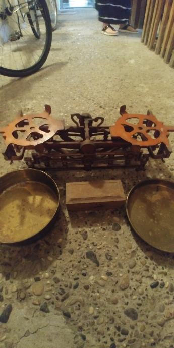 Kuhinjska vaga komplet sa posudama i utezima vrlo očuvana i stara ali potpuno i ispravna se prodaje.