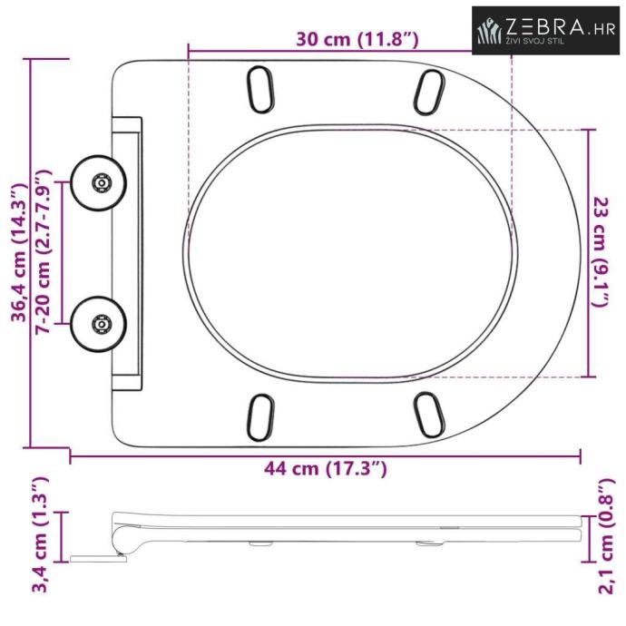 Kompaktna veličina: Dimenzije 44 x 36,4 x 3,4 cm omogućuju da daska odgovara većini standardnih WC-a, efektivno koristeći prostor bez opterećenja manjih površina. Ove pametne dimenzije čine je prilagodljivom različitim rasporedima kupaonica.