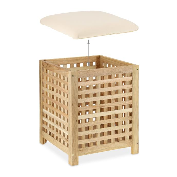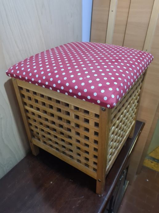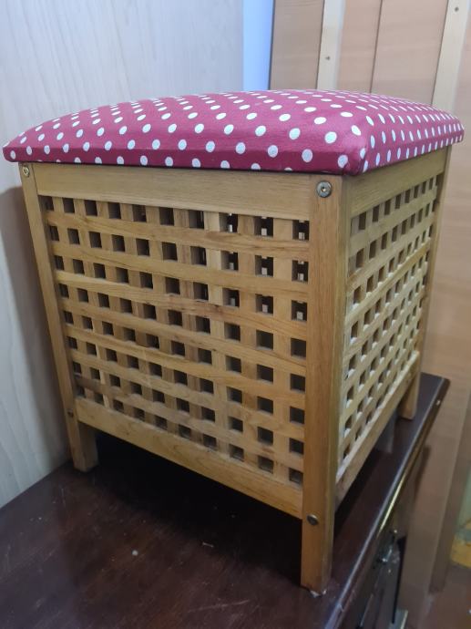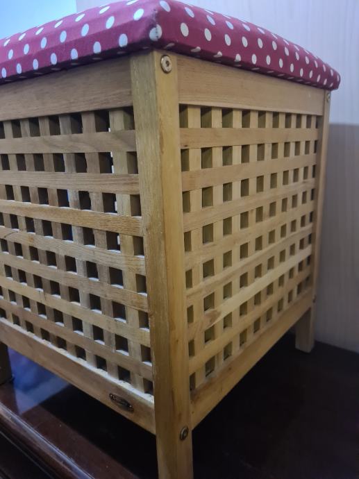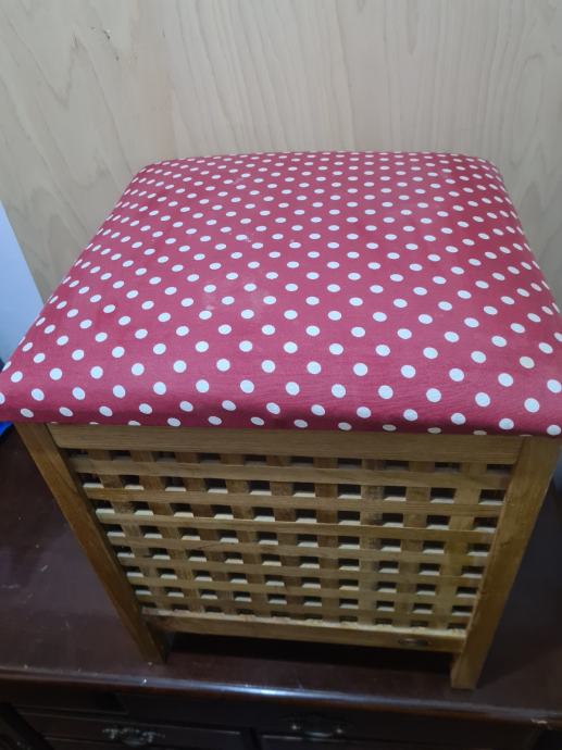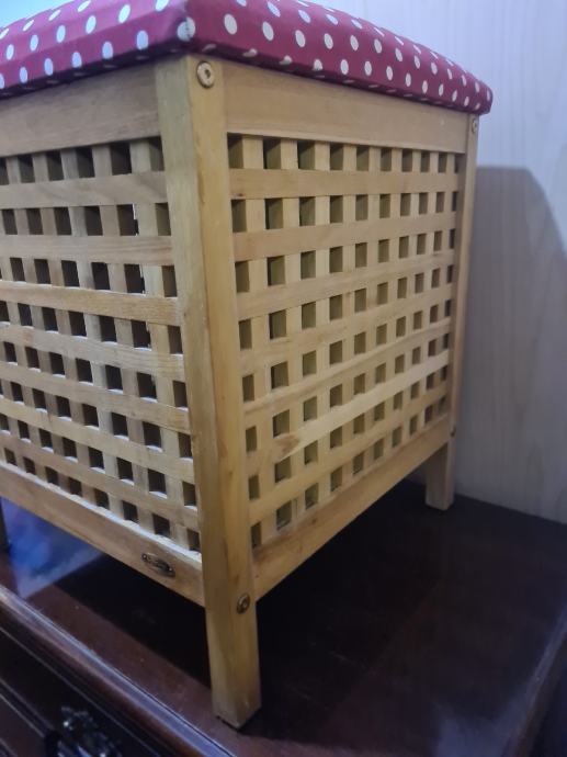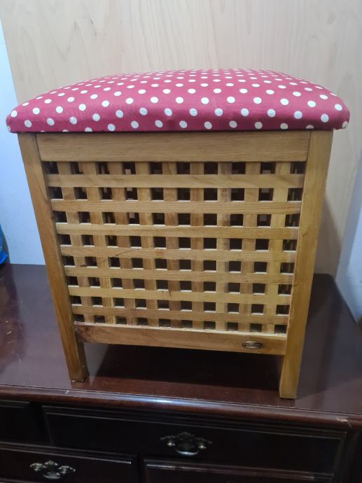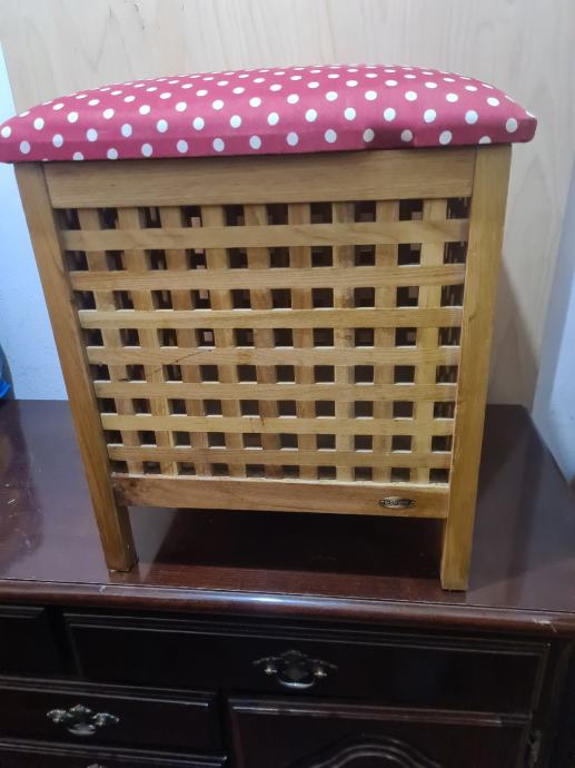 Drvena košara za veš, sa sjedalicom. Košara je na nogicama. Dimenzije košare 45x45x56cm. PUNO DRVO!