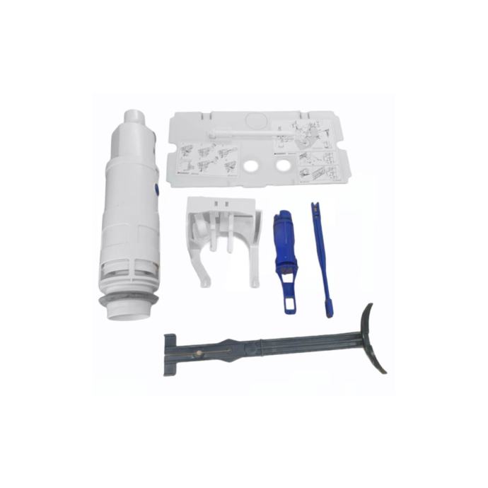 Geberit set za preradu za dvokoličinsko ispiranje, za ugradbeni vodokotlić tip 110.800 Za preinaku na dvokoličinska ispiranja, za Geberit UP tip 110.800 (godina proizvodnje 1988.–1997.). Set sadrži: - Zaštitna ploča - Izljevni ventil - Držač izljevnog ventila - Bazen - Ležaj poluga za aktiviranje - Pričvrsni materijal