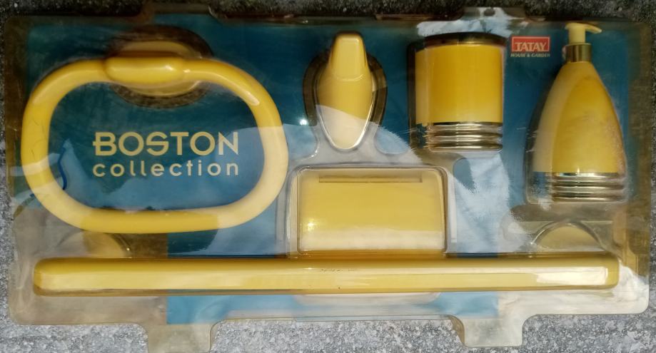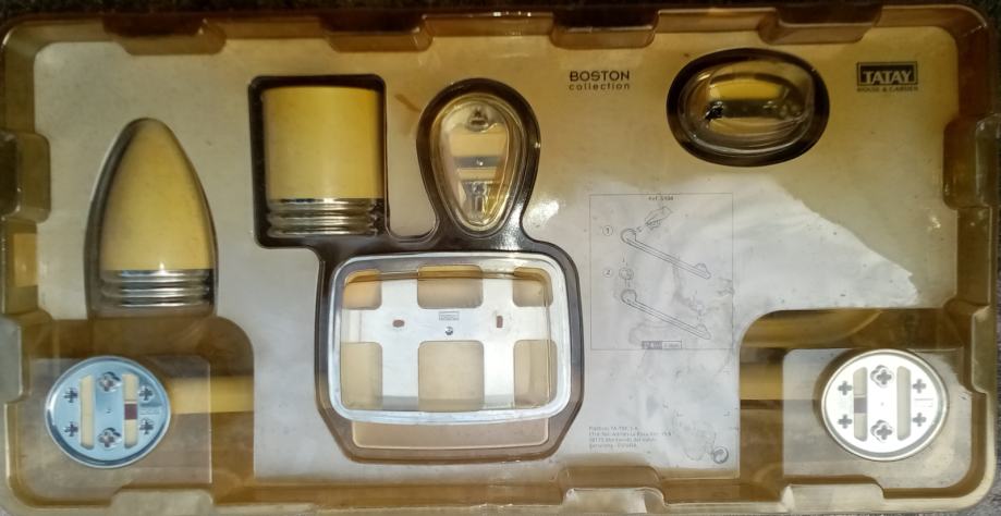 Set kupaonske galanterije šestdijelni "Boston collection" Tatay Spain. Komplet sadrži: 2 držača ručnika, kukicu, držač toaletnog papira, dozator za sapun i držač četkica za zube.