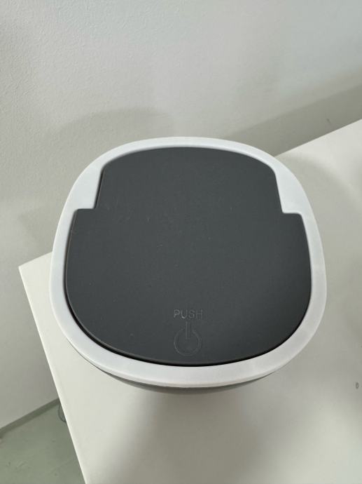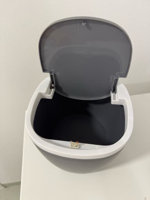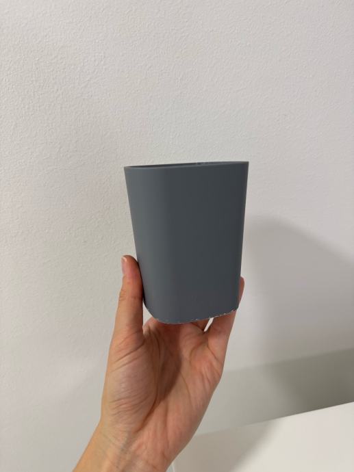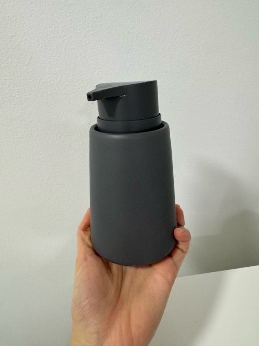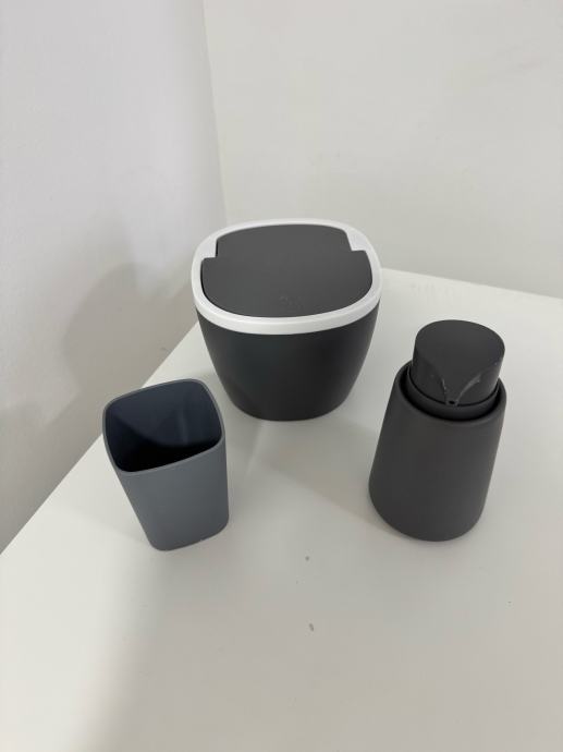 Kupaonski set sastoji se od keramičkog dozatora za tekući sapun, plastične posude za četkice za zube i male plastične kante za smeće.