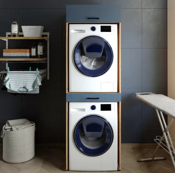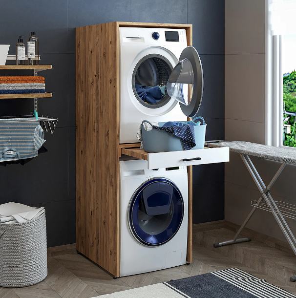 Praktična kombinacija sušilice i perilice rublja koja štedi prostor sa sklopivim ormarićem (dostupne su 2 opcije - 22 cm i 57 cm visine), policom na izvlačenje za košaru za rublje i visokim ormarićem za dodatno odlaganje. Ima optimalnu visinu, što će znatno olakšati pranje rublja.
