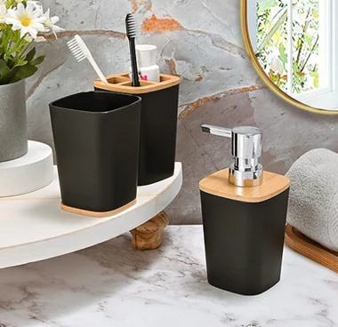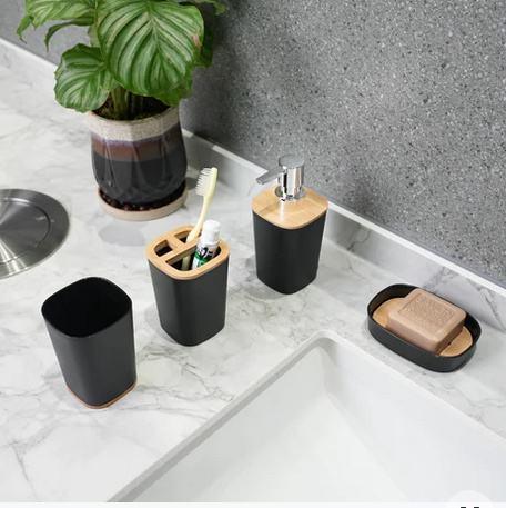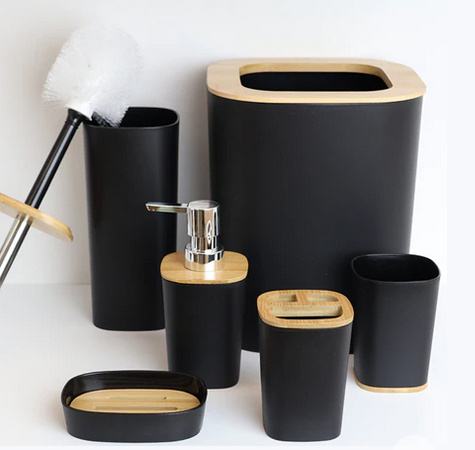 Unesite stil, funkcionalnost i dašak prirodne elegancije u svoju kupaonicu s ovim kompletnim setom galanterije od 6 elemenata. Minimalistički dizajn u mat crnoj boji, upotpunjen bambusovim detaljima, savršeno se uklapa u suvremene prostore i pruža luksuzan dojam.