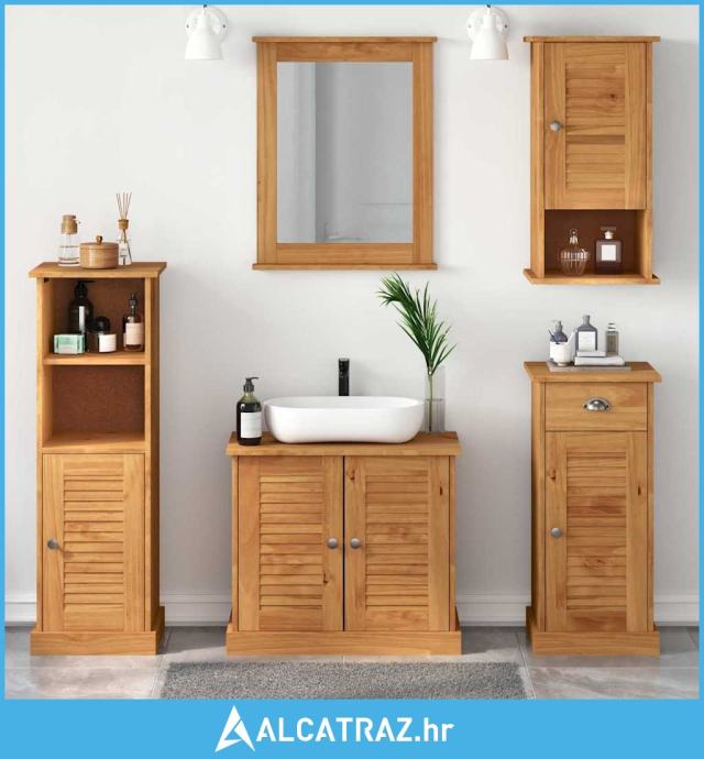 - Materijali: Napravljen od čvrstog borovog drva, ovaj set za kupaonicu se odlično drži u toplim i vlažnim uvjetima, tipičnim za kupaonice. Prirodni ton drveta savršeno se uklapa s rustikalnim završetkom, dajući mu lijep zemljani dojam.