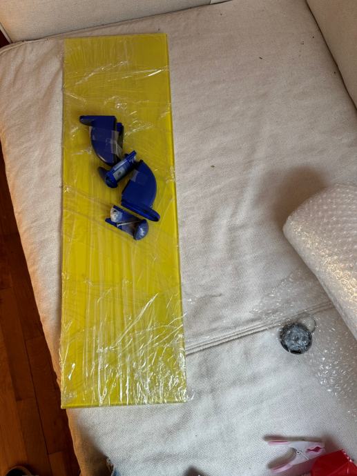 Staklena polica sa nosačima, žuta sa plavim držačima, moderna, praktična za kupaonicu i za svaki drugi prostor.