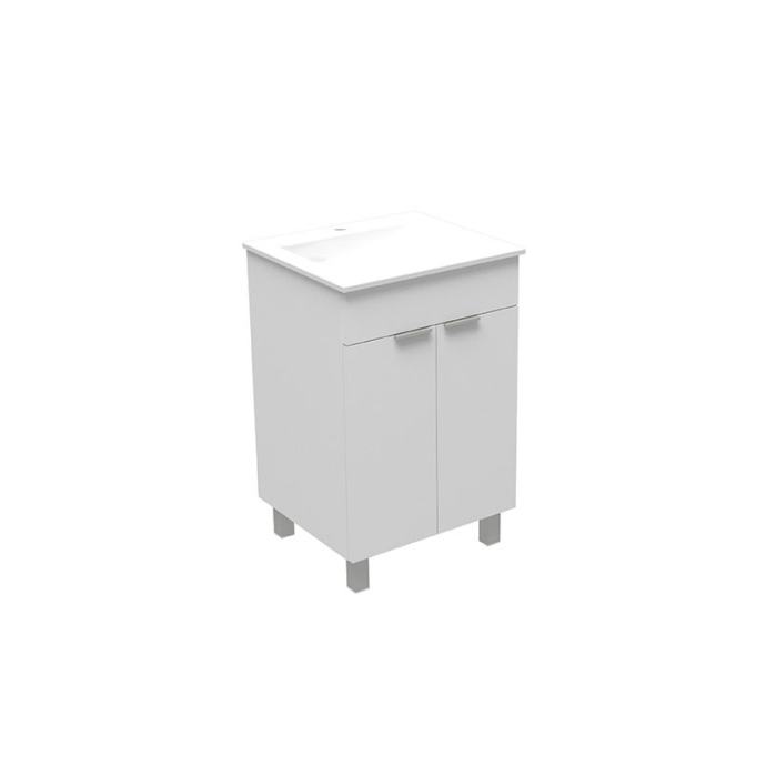 Fronte MDF obložen PVC folijom u dekoru bijeli sjaj, a korpus mat bijeli iveral. Ugradbeni keramički umivaonik uključen, no prodaje se bez sifona.
