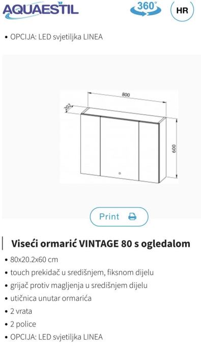 Prodajem novi Aquaestil ormarić s ogledalom kupljen u Kimi commerce-u. Prodaje se u originalnom pakiranju. Boja trupa - tamni hrast. Fiksno središte s ogledalom i ormarićem sa svake strane. Plaćen po punoj cijeni 450€, a prodaje se za 350€.