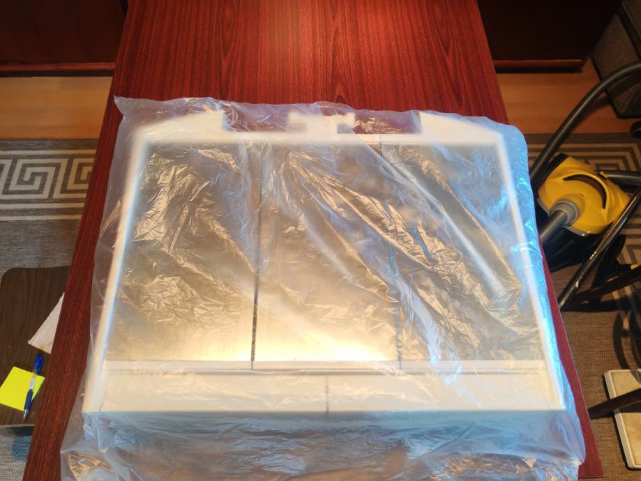Ima troja vratašca, koja su ispravna. Staklo je cijelo. Unutra ima jednu policu. Radi se o proizvodu od plastike.