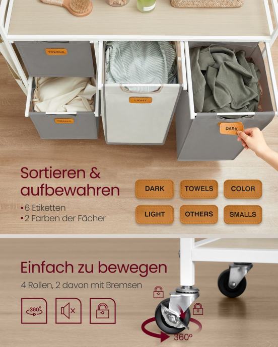 Ova kolica za pranje rublja sadrže dvije košare od 25L i dvije košare od 50L i nude prostor za 150L rublja. Na gornjoj polici možete pohraniti deterdžente, mrežice za rublje itd. Mali bočni džepovi i dalje nude prostor za male predmete. S 4 kotača, od kojih 2 imaju kočnice, ovaj razvrstivač rublja lako se pomiče i zaključava. S čičak kopčama i praktičnim ručkama, torbe se lako uklanjaju i transportiraju. S označenim dijelovima i jasnim uputama, ova pregrada za rublje s kotačima se brzo sastavlja tako da možete odmah početi sortirati svoje rublje. 6 priloženih naljepnica omogućuje vam sortiranje rublja po boji, na primjer. Naljepnice se lako mogu pričvrstiti čičak kopčama. Različite boje košara olakšavaju sortiranje. 1,5 x 1,5 cm čelične cijevi, visokokvalitetna iverica, vodoodbojna Oxford tkanina - kutija za rublje je robusna i elastična. Umjesto kotača, također možete pričvrstiti 4 podesive noge tako da stoji stabilno i sigurno na jednom mjestu. Za sve informacije nazovite na broj telefona 092/399-75-19