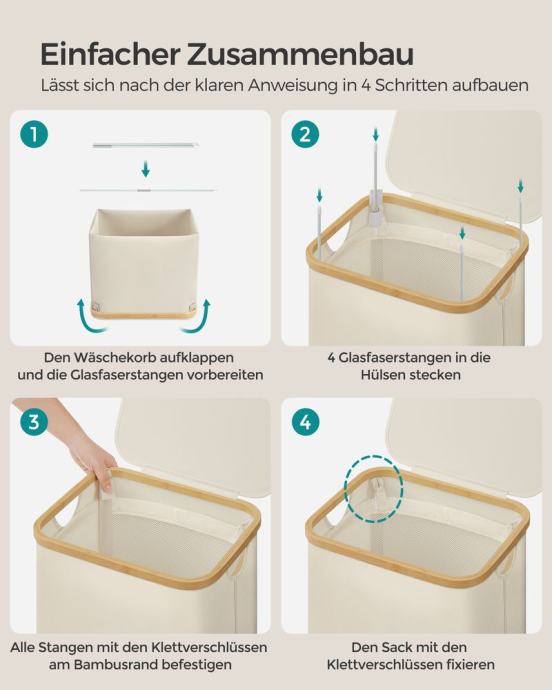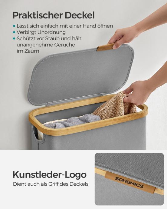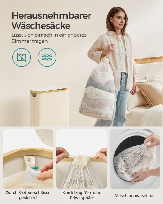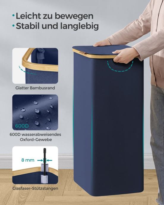 Ova tanka košara za rublje kapaciteta 65 L i dimenzija 42 x 22,5 x 70,5 cm dizajnirana je za posebno uklapanje u uske niše, što je čini idealnim izborom za male prostorije ili kompaktne praonice, također košara za rublje od 90 L, dimenzija 42 x 32 x 70,5 cm, nudi dovoljno prostora za tjedno pranje rublja od jedne osobe i pojednostavljuje vašu rutinu pranja rublja. Učvršćena čičak kopčama, vreća se lako uklanja. Uzice služe kao ručke za lakši transport. Zahvaljujući mrežastom dizajnu, prikladna je i kao torba za pranje za sortirano pranje u stroju. Jasne upute i alati nisu potrebni - možete sastaviti ovu košaru za rublje u samo 5 minuta. Poklopac štiti od prašine i štiti vašu privatnost. Logo od umjetne kože na poklopcu služi kao ručka za jednostavno otvaranje i dodaje dašak elegancije. Korpa za rublje izrađena je od Oxford tkanine debljine 600D, koja je vodoodbojna, otporna na trganje i jednostavna za čišćenje. Njegova unutarnja struktura poduprta je šipkama od stakloplastike za veću stabilnost. Za sve informacije nazovite na broj telefona 092/399-75-19