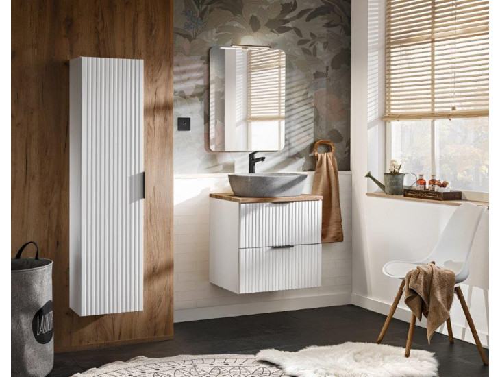 Kupaonski blok PIJA 60 izrađen je u bijeloj boji koja ističe njegov čist i moderan izgled. To je funkcionalan i estetski atraktivan set koji nudi puno prostora za pohranu i optički povećava kupaonicu. Dodali smo malo modernog pečata s radnom pločom u boji hrasta. U cijenu je uključen 1 x visoki ormarić, 1 x ogledalo, 1 x ormarić za umivaonik, 1 x radna ploča, 1 x LED rasvjeta i po želji umivaonik. Visoki ormarić sadrži mnogo polica, a ormarić ispod umivaonika ima dvije duboke ladice.