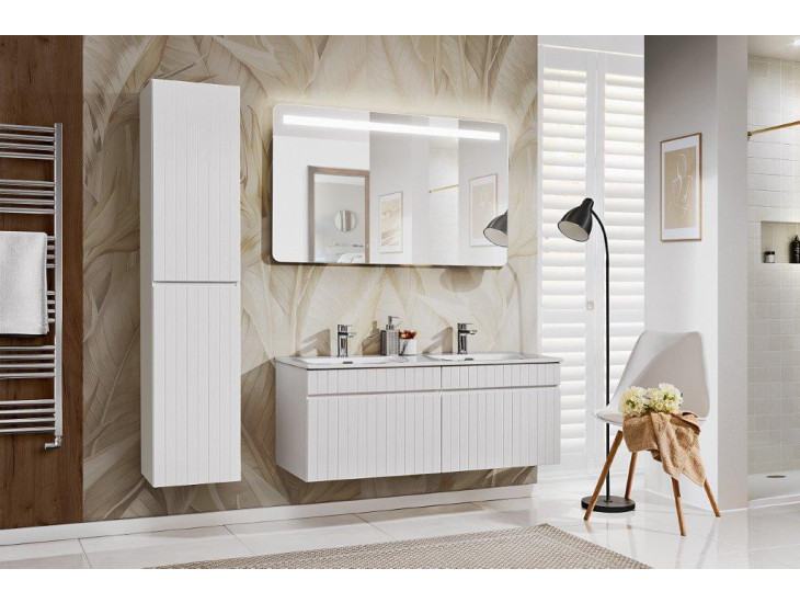 Kupaonski blok SUMMER 120 istovremeno je jednostavan i elegantan, karakteriziran vertikalnim utorima i integriranom ručkom - ova kombinacija čini kolekciju nježnom i modernom. Bijeli elementi pristaju uz svaki stil interijera kupaonice. Kolekcija je dizajnirana za ljude koji cijene praktična rješenja u kombinaciji s jedinstvenim stilom. U cijenu je uključeno: 1 x visoki ormarić, 2 x ormarići ispod umivaonika, 1 x LED ogledalo i 1 x umivaonik. Kolekcija je izrađena od kvalitetne lamelirane ploče debljine 16 mm. Ima mekano zatvaranje.