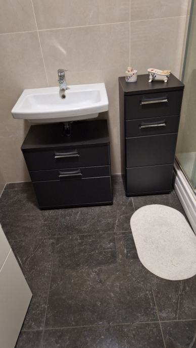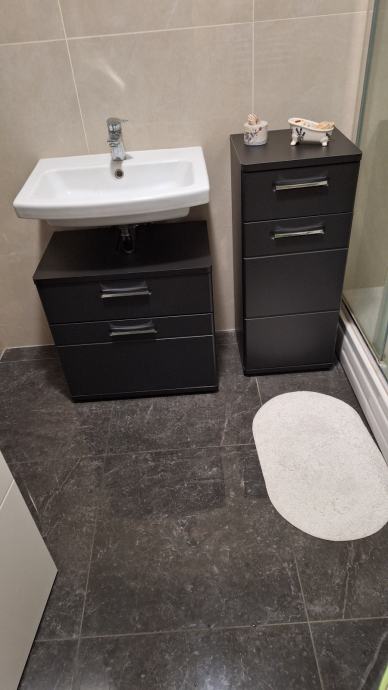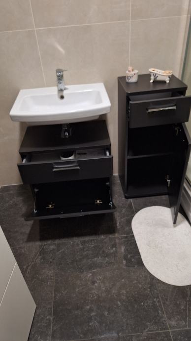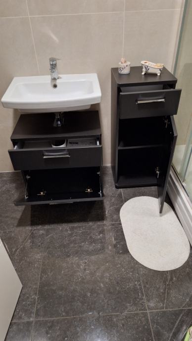 Kupaonski komplet koji se sastoji od donjeg ormarića ( D-38, Š-60, V-58 ) ispod umivaonika i bočnog ormarića (D-34,5 Š-37 V-87 ) prodajem.Cijena 79 eura.Tel 0911561957