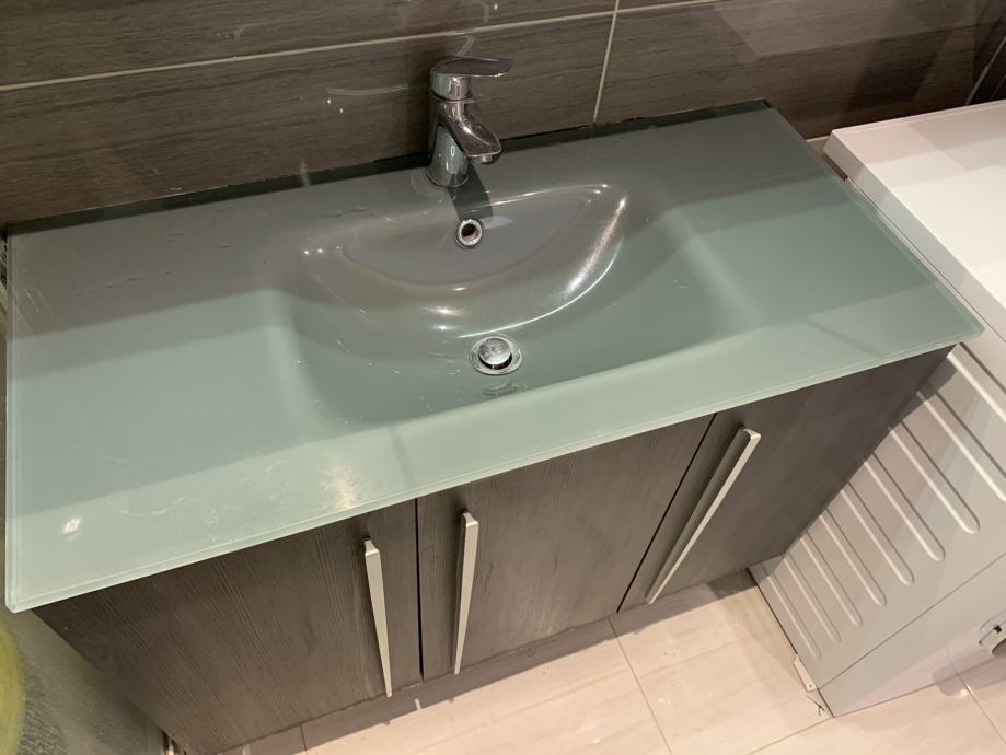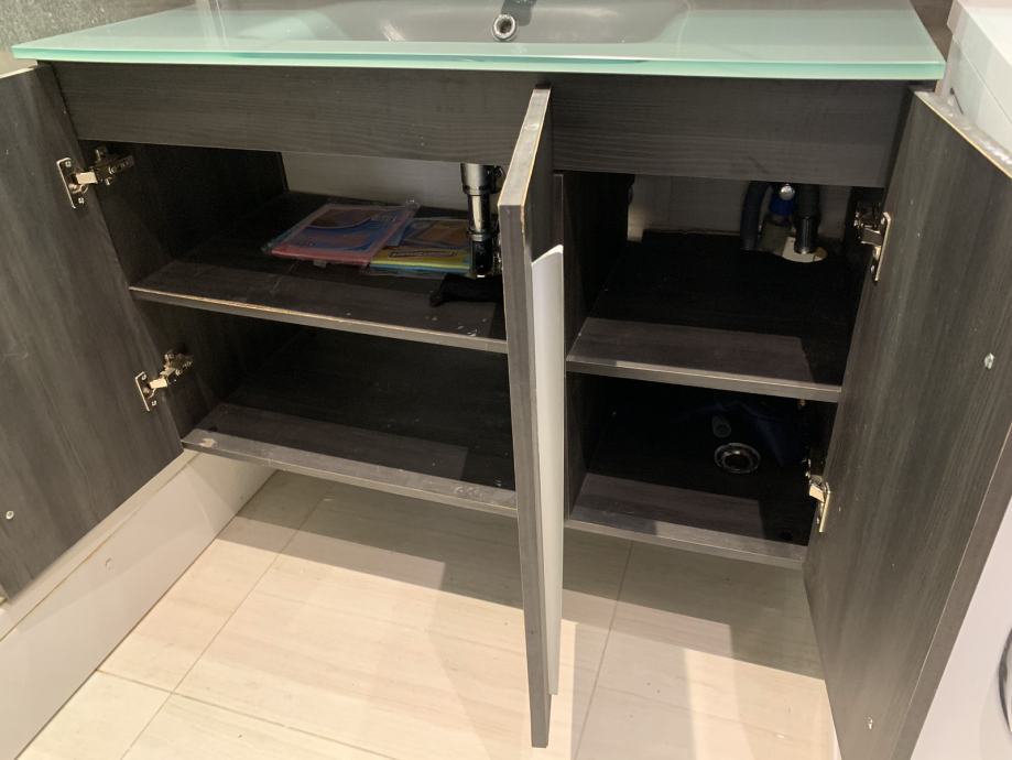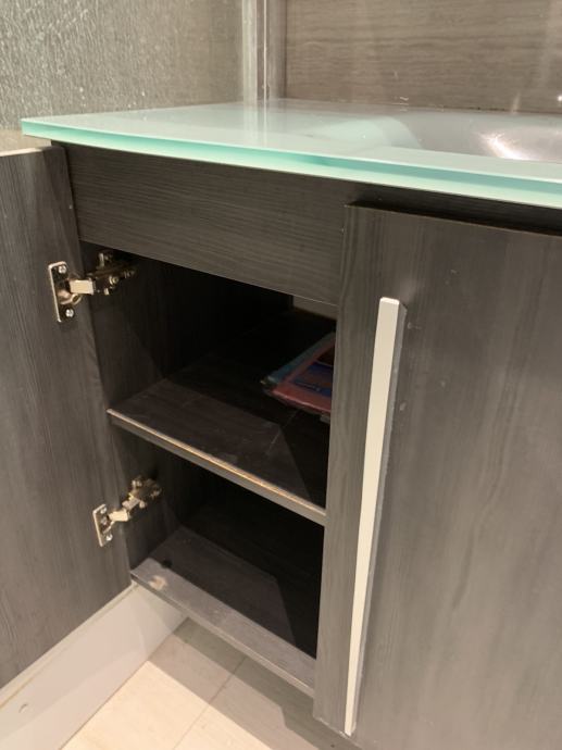 2. Camargue Espacio stakleni umivaonik s izljevom dim. 100 x 46 cm, na visećoj bazi (ormariću). Visina baze (ormarića) 61 cm, troja vrata s vertikalnim ručkama. UMIVAONIK KAO NOV I BEZ OŠTEĆENJA, ORMARIĆ S TRAGOVIMA VLAGE NA DONJIM RUBOVIMA (VIDLJIVO NA SLIKAMA)
