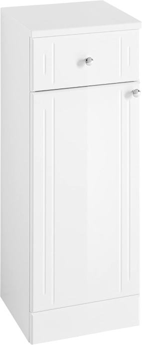 Ovaj moderni ormarić u visokom bijelom sjaju nedvojbeno će privući pažnju u vašoj kupaonici sa sjajnim kromiranim ručkama na gumbe.