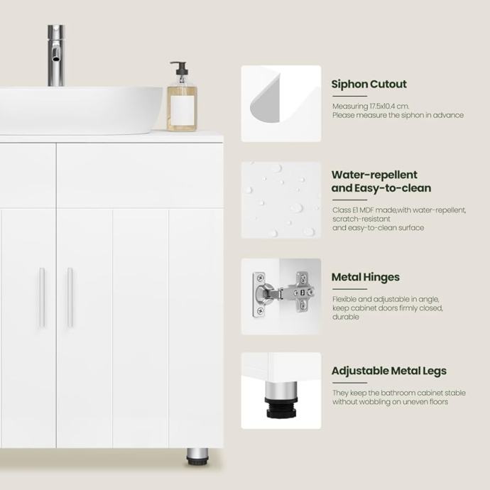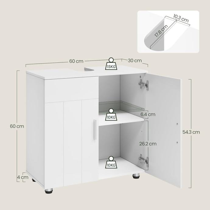 VELIKI PROSTOR - Ormarić ispod umivaonika mjeri 60 x 30 x 60 cm. Polica i 2 pretinca mogu bolje držati kupaonske predmete. Veličina sifona: 17,5 x 10,5 cm, molimo vas da unaprijed izmjerite mjere otvora sifona i umivaonika