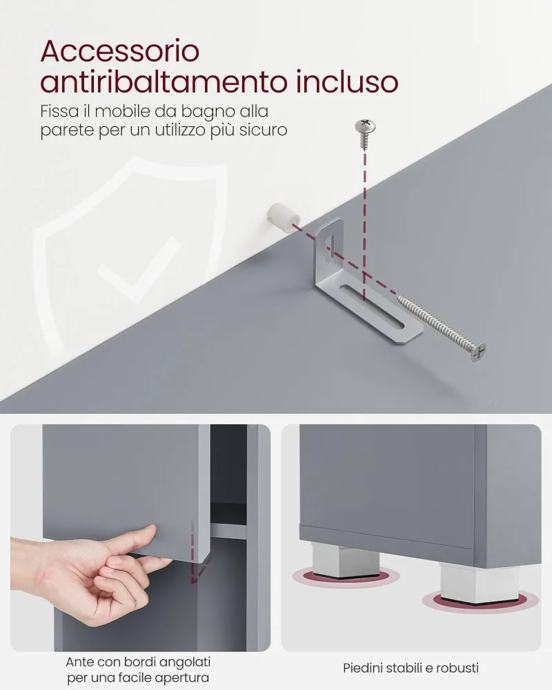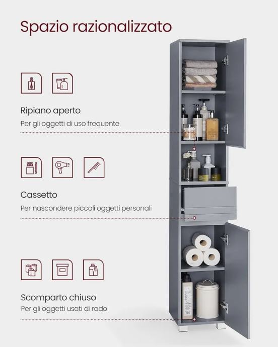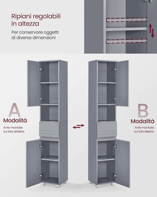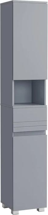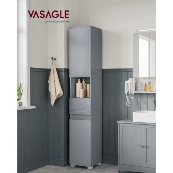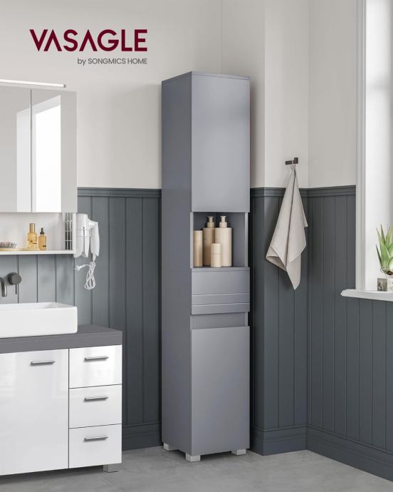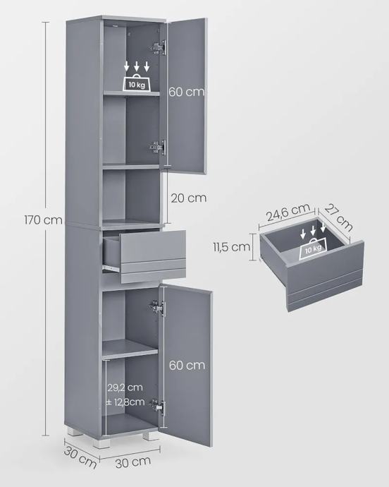 Kupaonski ormarić, Kupaonski ormarić koji štedi prostor, Visoki kupaonski ormarić, s ladicom, policom, pretincima s vratima, podesivim policama, 30 x 30 x 170 cm, Mistično siva