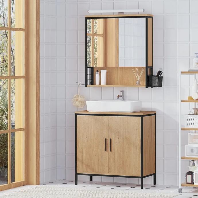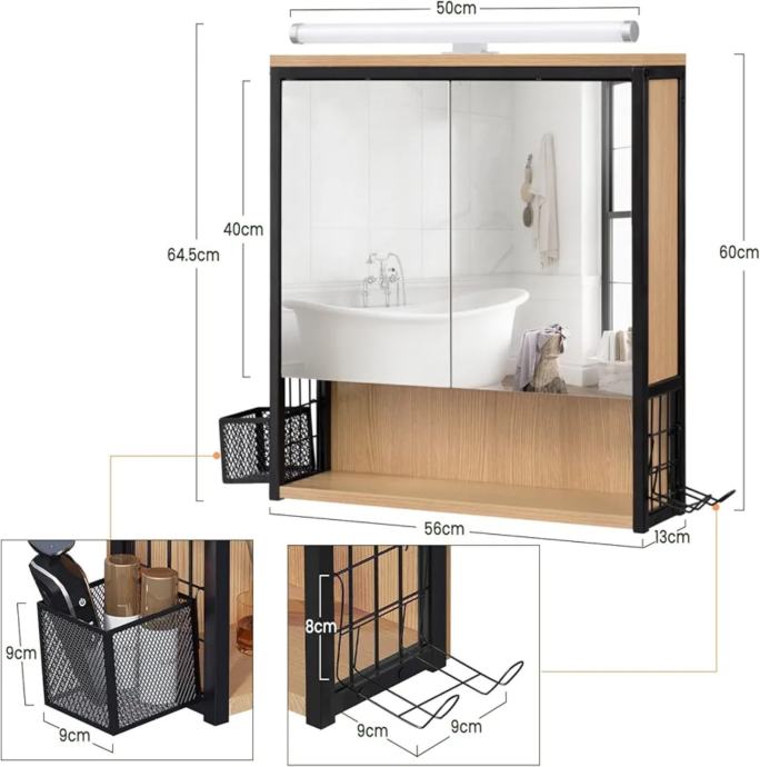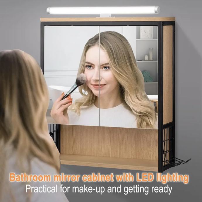 Kupaonski ormarić s ogledalom i rasvjetom, Kupaonski ormarić s ogledalom, Viseći kupaonski ormarić s podesivim držačem police i košarom, Izrađen od metala MDF, Crni + svijetli hrast