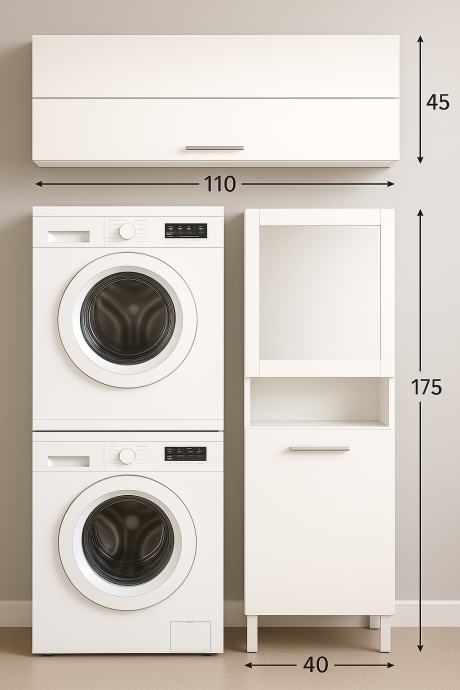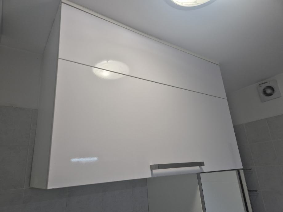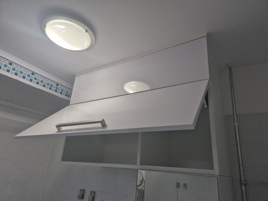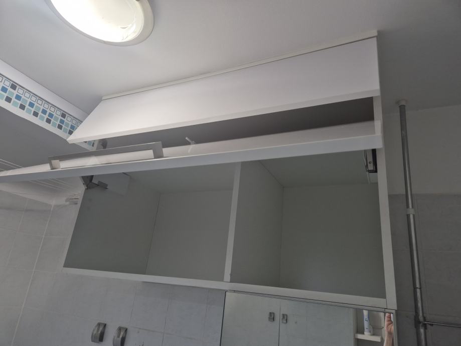 2. Ugradbeni ormar s pdiznim vratima prema van koji se montira na zid iznad vertikalno smještene perilice i sušilice rublja (Visina 75cm, Širina 110 cm, Dubina 45 cm).
