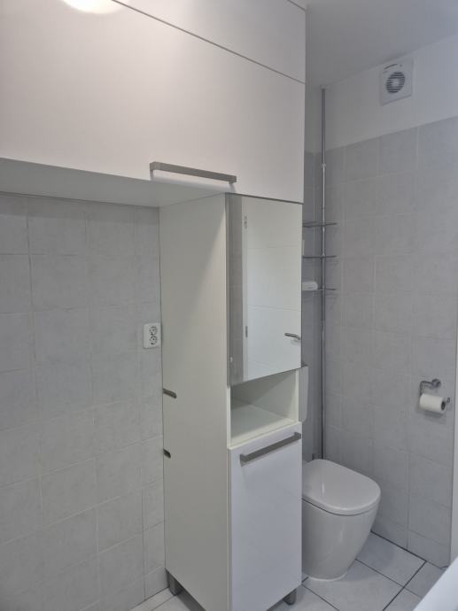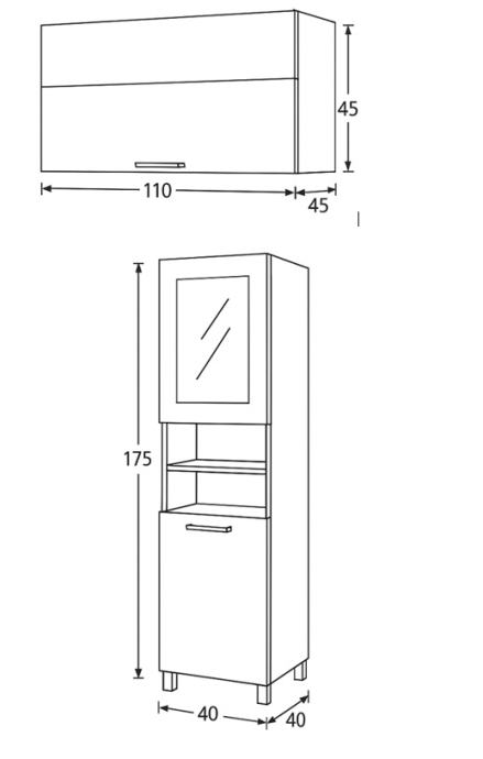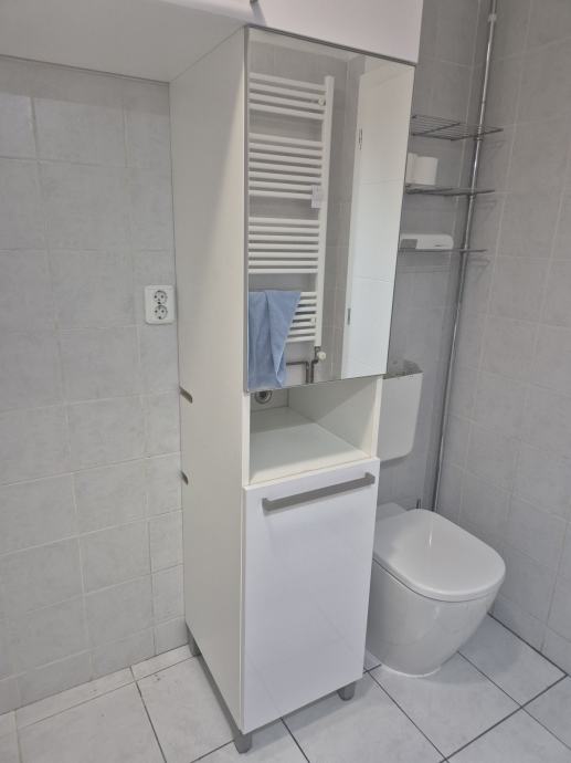 1. Visoki ormar koji u donjem dijelu ima prostor za koršaru za rublje, a iznad nje su smještene police i ormarić s vratima od ogledala (Visina 175 cm, Širina 40 cm, Dubina 45 cm)