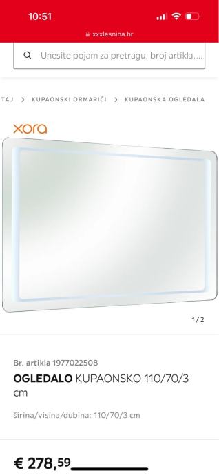 Novo, nekorišteno ogledalo Xora sa senzorom na dodir, kupljeno u Lesnini za 278 eura. Postavljeno na zid i skinuto jer nam se nije uklapalo u dizajn.